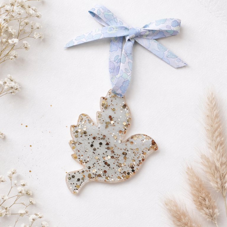 Colombe en résine epoxy transparante ornée de paillettes dorées